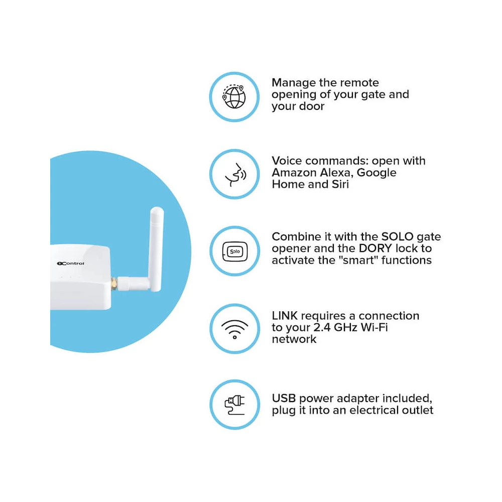 SOLO Link - WiFi smart home Hub for Solo productsLINK is the Wi-Fi smart home Hub for remote opening and voice commands. Connect LINK to your SOLO gate opener, your smart lock DORY and your padlock LOCO to revolutionise opening.
