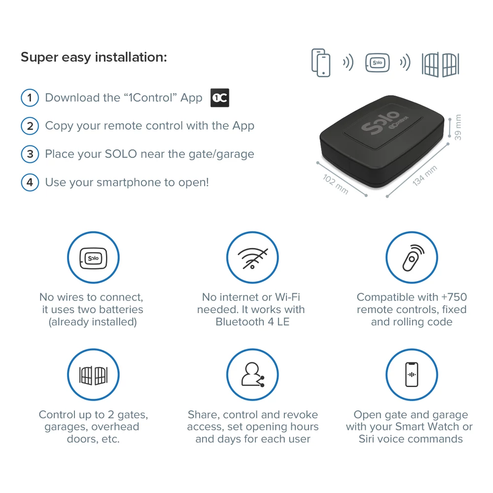 The SOLO Lite can be paired with 2 of a garage or gate radio device. It can be used with a maximum of 5 users (smartphones).